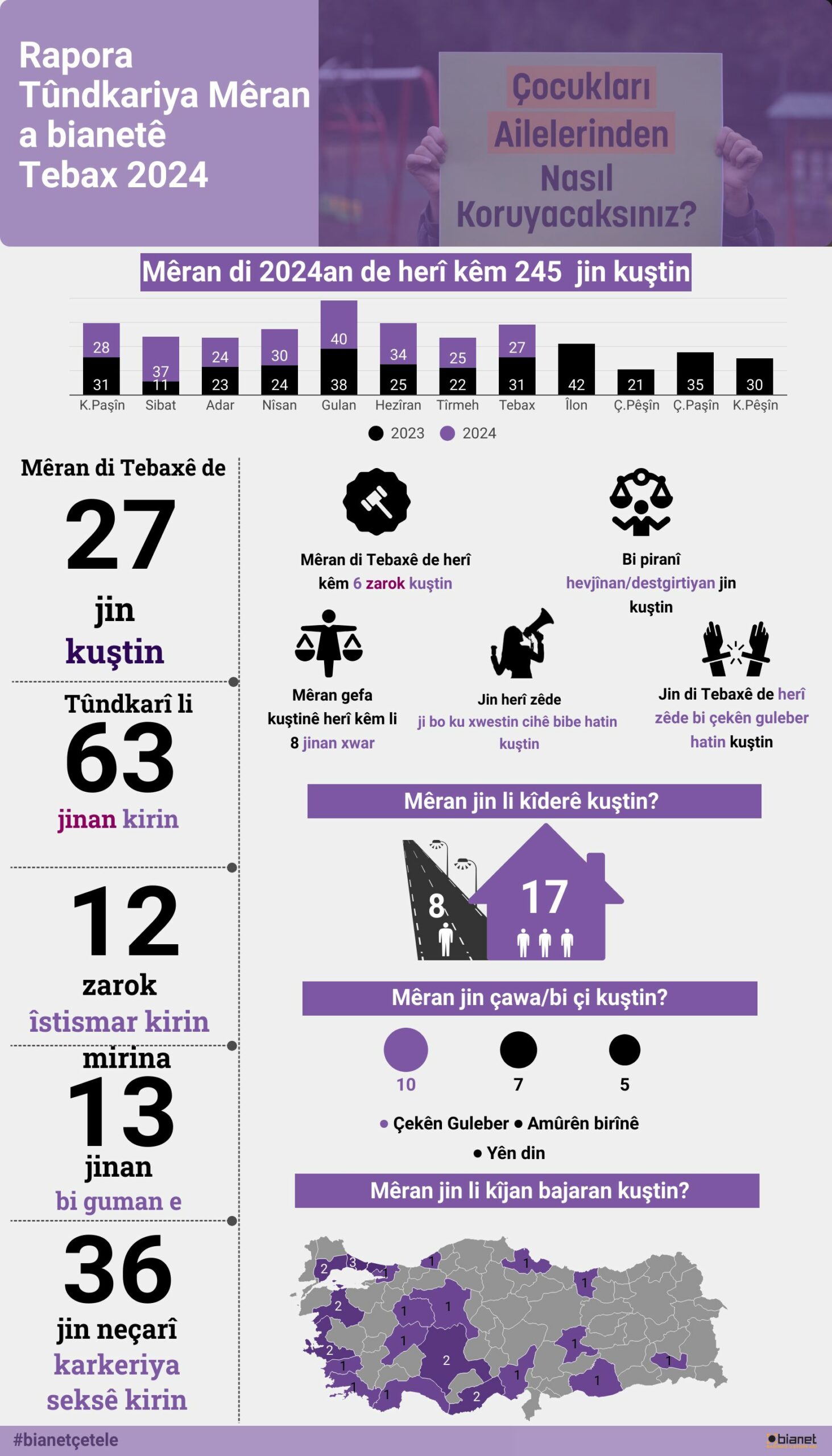Li gor nûçeyên ku bianetê ji rojnameyên herêmî û netewî, ji malperên nûçeyan û ajansan berhev kirin, mêran di meha Tebaxê de bi kêmanî 27 jin û 6 zarok kuştin.