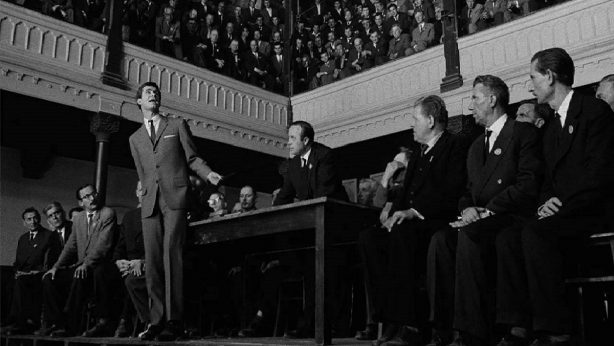 Hukuksal kurumların sayısını, büyüklüğünü ayrıca hukuksal şahsiyetlerin niceliğine bakılırsa söylediklerim çok daha iyi anlaşılacaktır. Welles’in kendisi de, yönetmen olmakla birlikte, oyuncu olarak bu şahsiyetler içinde yer almıştır. Sinemanın imkanlarını çok iyi bildiği belli olan yönetmen, dış mekanı ve bilhassa modern kurumları, adliye, mahkeme vs binalarını gösterirken devasa çekimlere imza atıyor. Beri yandan insanları, kadın veya erkek olsun, olduğundan çok daha küçük gösteriyor! Dolayısıyla sinemanın modern dünyayı, diğer sanatlara oranla son derece etkili betimlediğini ileri sürüyoruz.